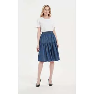 Introducing the Tronjori Women's A-Line Lightweight Tencel Denim Tiered Short Skirt, a stylish and versatile addition to your wardrobe. Crafted from 100% Lyocell (Tencel), this innovative fabric is not only soft and flowy but also lightweight, making it perfect for every season. The unique denim blend combines a classic look with enhanced comfort, ensuring you feel as good as you look. This knee-length skirt features a flattering A-line silhouette, delicate ruffles on the tiers, and a full...