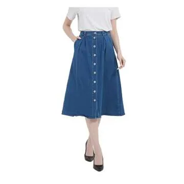 Show moreThe Tronjori Women's A Line Long Midi Denim Skirt with Button Front is the epitome of casual elegance, designed for women who seek both comfort and style in their wardrobe. Crafted from a unique blend of 99% Cotton and 1% Spandex, this medium-weight stretch denim skirt offers a soft and comfy feel while ensuring you move freely throughout your day. The classic A-line silhouette flatters various body types, making it a versatile essential for all seasons. Featuring functional buttons on the front and stylish pleats on the front panels, this skirt perfectly combines practicality with a chic look. Additionally, with side entry functional pockets, it's tailored to meet the needs of modern women on the go.