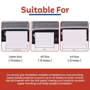This binding machine, equipped with an adjustable margin control system, ensures precise hole punch alignment, making it suitable for both standard and legal-sized documents. With a punch capacity of up to 20 sheets at once, you can streamline your workflow and boost productivity. It also includes a foot pedal, allowing you to easily control the coil inserter while keeping your hands free for smooth page movement.