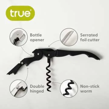 Show more Introducing the **True Brands TrueTap Double Hinged Waiters Corkscrew**, expertly crafted for wine aficionados and casual sippers alike. This elegant matte black corkscrew is not just a wine opener, but a statement piece that enhances your wine experience with style and sophistication. Designed by TrueTap, a reputable brand synonymous with quality and reliability, this tool pairs exceptional functionality with a sleek appearance, making it the ultimate accessory for any wine lover.