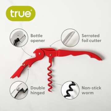 Introducing the True Brands TrueTap Double Hinged Waiters Corkscrew, a perfect fusion of style and practicality that every wine aficionado dreams of! Finished in a cheerful fire-engine red, this corkscrew is not just an eye-catcher but also crafted for superior performance. Packed with features like a bottle opener, a serrated foil cutter, and a 5-turn non-stick worm, it ensures effortless wine opening, making every uncorking experience a pleasure rather than a chore. It’s durable, easy...