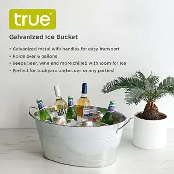 Show more Introducing the True Ice Buckets for Parties – a must-have addition for your gatherings! Measuring 6.3 gallons (23.8 liters), this large galvanized tub is specifically designed for chilling a variety of beverages, ensuring your drinks are served at the perfect temperature. Its durable construction, made from high-quality, superior galvanized steel, ensures longevity and resistance against the wear and tear of any event. With convenient handles for easy transport, moving this stylish bucket from your kitchen to the patio is effortless, making it ideal for backyard barbecues, parties, and family gatherings.