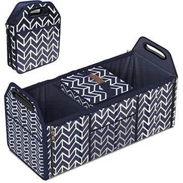 Show moreIntroducing the ultimate solution for vehicle organization – the Trunk Organizer with Detachable Insulation Cooler Bag! This versatile storage bag not only maximizes your trunk space but also brings a sense of order to your vehicle. Measuring at 24.8 X 11.4 X 9.8 inches, it is designed with a sleek navy blue and white pattern that adds a touch of style to your car's interior. It's perfect for all your essentials, from grocery shopping to carrying sports equipment. This trunk organizer features three spacious, collapsible compartments that can adapt in size, making it a flexible choice for your diverse storage needs.