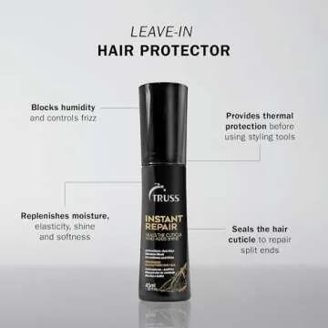Show more Introducing the Truss Instant Repair - Daily Leave-In Hair Protector and Humidity Blocker, your hair's new best friend! This exceptional leave-in treatment is expertly formulated to transform and elevate your hair care routine, making frizzy and damaged hair a thing of the past. Infused with powerful anti-frizz and humidity protection, it not only keeps your styles intact but also repairs and seals the hair cuticle, guarding against split ends and promoting healthier, manageable locks. Say goodbye to bad hair days and hello to beautifully nourished hair!