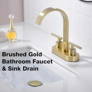 Show moreElevate your bathroom space with the TRUSTMI 4" Centerset Bathroom Faucet, a striking combination of functionality and luxury. Crafted from heavy-duty SUS 304 stainless steel, this faucet is built to last, boasting a premium commercial-grade construction that ensures it withstands the rigors of high-traffic environments such as hotels, restaurants, and upscale homes. Its beautiful brushed gold finish not only adds a touch of elegance but also resists fingerprints and corrosion, keeping your faucet looking pristine.