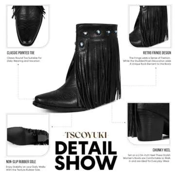 Tscoyuki Fringe Western Cowgirl Boots for Women - Pointed Toe, Low Chunky Heel, Black, Size 8