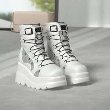 Tscoyuki Platform Ankle Boots for Women Chunky High Heel Booties Goth Round Toe Combat Boots Women Lace Up Motorcycle Wedges