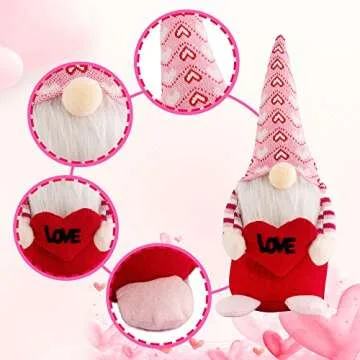 Show more Embrace the spirit of love this Valentine’s Day with the adorable TSGEEG Valentine Day Gnomes Decorations Plush set. This charming duo, featuring Mr. Gnome and Mrs. Gnome, is crafted to enhance your holiday decor with a touch of whimsy and warmth. Made from premium soft plush material, these unique gnomes are not only comforting to the touch but designed to be tear-resistant, ensuring they remain a lovable part of your home décor for years to come. Each gnome includes a bendable wire in its hat, allowing you to adjust their poses and create delightful displays in any corner of your home.