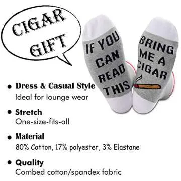 Show moreIntroducing the TSOTMO 2 Pairs Cigar Gift Novelty Socks, crafted meticulously for cigar enthusiasts who love to add humor and comfort to their daily wardrobe. Made from a high-quality blend of 80% Cotton, 17% Polyester, and 3% Elastane, these socks ensure a heavenly blend of softness, breathability, and stretchiness. Say goodbye to fading colors and peeling prints; our socks are designed to hold up beautifully in the laundry, making them a durable choice for both men and women. With the cheeky quote If You Can Read This Bring Me A Cigar sewn directly into the fabric, these socks are not only amusing but also a delightful conversation starter.