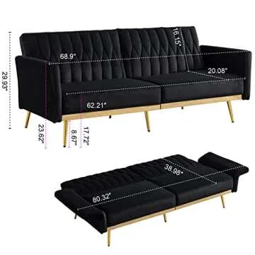 TTGIEET Velvet Convertible Futon Sofa Bed with Golden Metal Legs, 70" Tufted Loveseat Couch Sleeper Futon Sofa with Adjustable Armrests for Home Living Room Bedroom (Black)