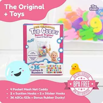 Tub Cubby Original Bath Toy Storage - Hanging Bath Toy Holder, with Suction & Adhesive Hooks, 14"x20" Mesh Net Shower Caddy for Kids Bathroom Decor, Bedroom Toy Organizer (Classic Storage + 26 Toys)