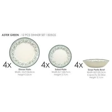 TUDOR ROYAL 12-Piece Round Porcelain Dinnerware Set, Service for 4 - Aster GREEN Design, Multicolor Floral, Plates Bowls Mugs Dishes, Premium Quality Tableware, Unique Pattern, Glossy