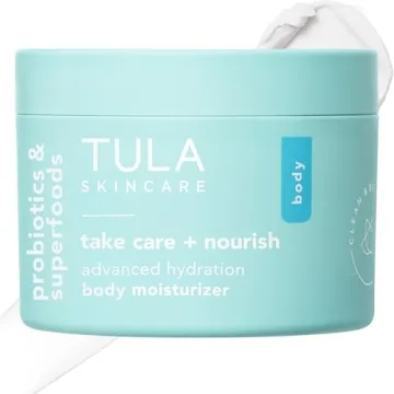 Show more Indulge in the ultimate skin care experience with TULA Skin Care Take Care + Nourish - Advanced Hydration Body Moisturizer. This luxurious moisturizer is a perfect blend of powerful probiotic extracts and skin superfoods, meticulously crafted to transform your skin. Enriched with the fresh, invigorating essence of Vitamin C and Yuzu, this formula not only deeply hydrates but also brightens your skin's tone and enhances its texture, leaving you with a luminous glow that radiates confidence.