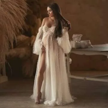 Tulle Maternity Dress for Photoshoot Long Puffy Sleeves Off Shoulder Pregnancy BabyShower Dresses Pearl Bridal Lingerie Robe White S-M