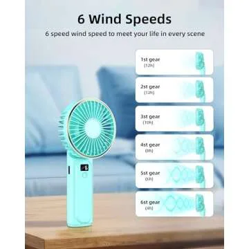 Show more Introducing the TUNISE Portable Handheld Fan, the ideal solution for anyone seeking comfort and relief from the heat during those sweltering summer days. This innovative handheld fan is designed with a 4000mAh rechargeable battery, allowing it to operate continuously for 4 to 18 hours, depending on the chosen wind speed. Whether you’re at home, traveling, or simply enjoying a day out, its ultra-quiet operation of less than 15db ensures no disruptive noise to interfere with your conversations or relaxation. With six adjustable speeds and the ability to simulate natural wind, you can enjoy a gentle breeze or a powerful gust as needed.