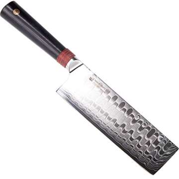 Show more Introducing the TUO Damascus Cutlery Nakiri Knife, a meticulously crafted 6.5” vegetable cleaver designed for chefs and home cooks alike. Made with precision, this knife features a cutting core of high-quality AUS-10 high carbon stainless steel, ensuring exceptional durability and razor-sharp performance. The stunning Damascus pattern not only enhances the knife's aesthetic appeal but also provides a characteristic hardness that promotes long-lasting sharpness. Ergonomically designed, the G10 handle offers a comfortable grip that allows for precise control during use, making every chopping, slicing, and mincing experience efficient and enjoyable. Presented in a luxurious gift box, this knife manifests style and performance, making it the perfect addition to any kitchen.