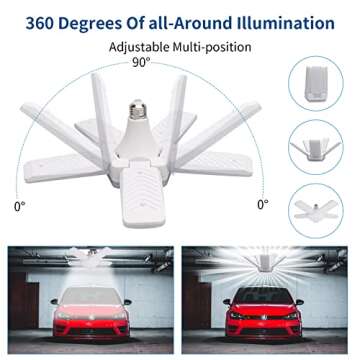 Show moreIntroducing the TUODAW LED Garage Lights – a groundbreaking lighting solution designed to illuminate your spaces like never before. Each pack includes two state-of-the-art deformable LED lights, each boasting five adjustable panels that provide an impressive 10,000 lumens of brightness. With a natural 6500K daylight color temperature and a CRI85+ rating, these lights deliver a clear and vibrant glow, creating a work environment that promotes focus and productivity. Engineered with flexibility in mind, the panels can be adjusted to a remarkable 90°, ensuring 360-degree illumination, eradicating blind spots and transforming any dim area into a beacon of light.
