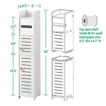 Show more Transform your bathroom experience with our innovative toilet paper storage cabinet, an essential addition to any modern bathroom. This sleek and stylish cabinet, crafted by a reputable brand, features a compact design that allows it to fit perfectly into tight spaces while providing ample storage for up to five standard rolls of toilet paper. The two-door design and open shelves ensure everything you need is at your fingertips without cluttering your bathroom.
