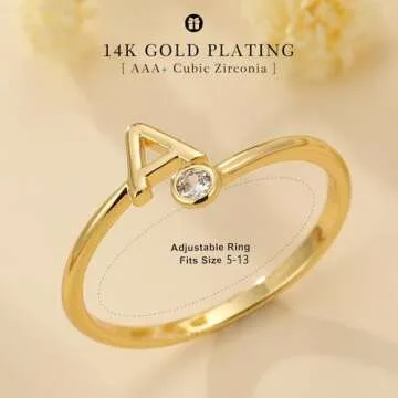 Show more This exquisite gold ring is designed with elegance and personalization in mind, featuring crystal initials from A to Z. Each letter represents not just a symbol but carries a special meaning—your initial, your lover's, your daughter's, or your son's. Its aesthetic appeal is undeniable, making it a striking accessory that not only adds glamour but fosters a connection to those significant to you. Made from high-quality materials, this ring consists of cubic zirconia and 14K gold plated copper, ensuring it's free from nickel and lead. The result? A durable, tarnish-free piece that will never turn your finger green, making it ideal for everyday wear.