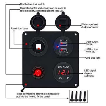 TURN RAISE Dual USB Charger Aluminum Switch Panel + LED Voltmeter + 12V Power Socket + ON-Off Button Switch