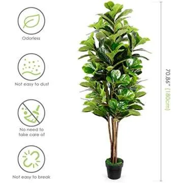 Show more Transform your living space into a lush, tropical paradise with the stunning six feet Fiddle Leaf Fig Tree. This magnificent artificial tree stands at a full 70.8 inches and is designed to elevate any decor, whether it's in your home, office, or garden. Made from high-quality polyester and plastic materials, it beautifully mimics the natural elegance of real foliage without the hassle of maintenance. With its vibrant green leaves and life-like appearance, this fiddle leaf fig creates an atmosphere that feels like a sunny holiday all year round.