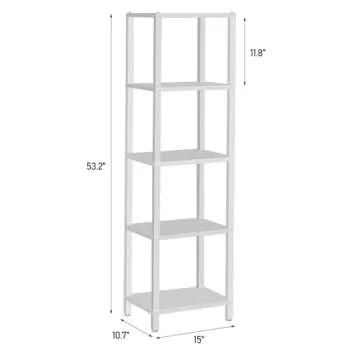 The dimensions of this compact bookshelf are tailored for convenience, measuring just 10.7"D x 14.5"W x 53.2"H. Despite its slim profile, it offers an impressive amount of storage space to accommodate your books, family photos, gadgets, and kitchen utensils. This 5-tier bookcase is not only lightweight and easy to move; it effortlessly transforms any cluttered space into an organized sanctuary, allowing you to showcase your favorite items beautifully.