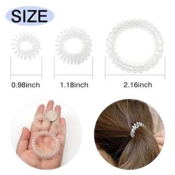 Show moreDiscover the TUUXI 12pcs Spiral Hair Ties, an essential accessory for any woman looking to combine functionality with style. Each pack includes three sizes of clear hair ties: large (2.16 inches/5.5 cm), medium (1.18 inches/3 cm), and small (0.98 inches/2.5 cm), ensuring versatility for different hairstyles and preferences. Crafted from waterproof plastic, these elegant coils are perfect for swimming or bathing, delivering a hygienic alternative to traditional cotton rubber bands. Say goodbye to hair breakage and tangling; our spiral design expertly spreads pressure across the hair, effectively preventing painful band marks and allowing you to rock a ponytail with confidence and grace.