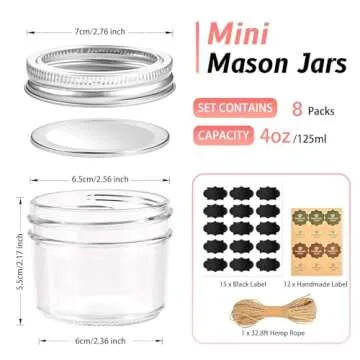 Show moreIntroducing the **TUZAZO Small Mason Jars 8 Pack**, perfectly designed for all your storage and DIY needs! Made with high-quality, food-grade glass, these **4 oz mini jars** are ideal for keeping your favorite jams, jellies, herbs, and spices fresh and easily accessible. Featuring a unique, premium **2-piece split-type lid**, they ensure a tight, leak-proof seal, giving you peace of mind whether you’re storing tasty overnight oats or crafting handmade gifts. With an exquisite transparent look and easy-to-clean design, the inner contents of these jars shine through, making them not only practical but also a stylish addition to your kitchen or craft space.