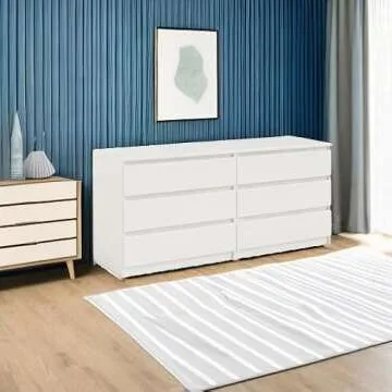 Show moreIntroducing a stunning and modern dresser that combines practicality with elegance. This contemporary piece stands out with its sleek design, allowing it to blend seamlessly into any room decor. Shipped conveniently in two boxes, assembly is required, but the effort is well worth it as the finished product enhances the ambience of your home. Featuring six spacious drawers, this dresser allows you to store everything from delicate garments to bulky clothing items. The handle-free drawers maintain a streamlined look while the extra high drawer sides ensure ample space and functionality.
