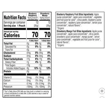 Show moreIntroducing Twisted Fruit Bites, a delicious and nourishing snack that’s perfect for your active lifestyle! Bursting with the vibrant flavors of Blueberry Raspberry and Strawberry Mango, each individually wrapped bite is designed for ease and convenience. Made from organic ingredients, these fruit bites are not only a guilt-free indulgence but also a wholesome treat you can enjoy anytime, anywhere. Whether you’re commuting, at work, or hitting the gym, these fruity snacks fit effortlessly into your busy routine. Perfectly portioned at 0.71oz, they are easy to stash in your purse, car, or office drawer, ensuring you always have a tasty treat within reach.