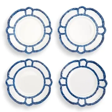 Two's Company 4-Pack Bamboo Rim Accent Kitchenware Set - Durable Melamine Plates with Elegant Blue Rim, Dishwasher Safe, Perfect for Parties & BBQs