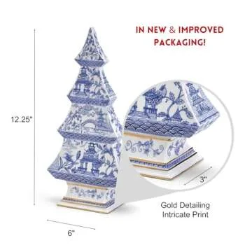Two's Company Inc. White & Blue Ceramic Christmas Tree, 12" Vintage Tabletop Holiday Figurine, Chinoiserie Xmas Table Decor