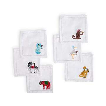 Two's Company Party Animals Set of 6 Embroidered Hemstitch Cocktail Napkins