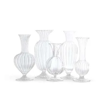 Show moreIntroduce a masterpiece of style and elegance into your home decor with the Two's Company Verre Set of 5 Fluted Vases. Each vase features a unique fluted design, beautifully hand-blown from high-quality glass, ensuring that no two pieces are alike. Their varying shapes and sizes make them versatile decor elements, whether you choose to display them as a cohesive arrangement or scattered throughout your space to highlight individual beauty. Perfect for showcasing your favorite blooms, these vases instantly elevate the ambiance of any room, from your coffee table to your windowsill.