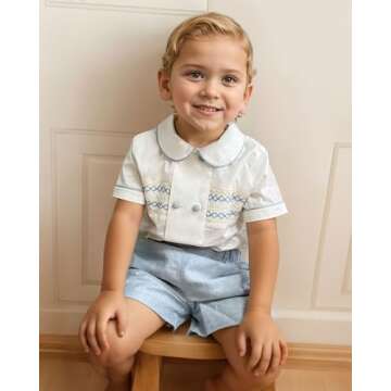 Show moreIntroducing the **Twoflower Smocked Toddler Boy Outfits**, a delightful and stylish summer clothing set that is perfect for your little prince! This 2-Piece set features a charming short-sleeve button-down shirt paired with shorts, all crafted from high-grade 100% cotton. The unique **smocked** design, inspired by a retro British royal tradition, adds a touch of elegance and nostalgia to your toddler's summer wardrobe. With its breathable, lightweight fabric, your child will stay comfortable and stylish all day long, making it an ideal choice for any summer occasion.