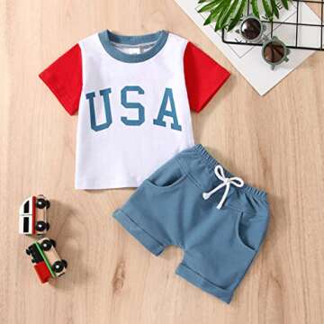 Show more Celebrate your little one's patriotic spirit with the adorable Twopumpkin Baby 4th of July Outfit. Made from premium, soft cotton, this ensemble is designed to be comfortable against your baby's delicate skin. The outfit features a charming American flag theme in bright red, white, and blue, perfect for both girls and boys. The oversized summer romper and matching t-shirts ensure your child is not only fashionable but also comfortable during the warm July weather. With variants available for newborns to toddlers up to 5T, your little one can look cute while joining in on the celebration of Independence Day.