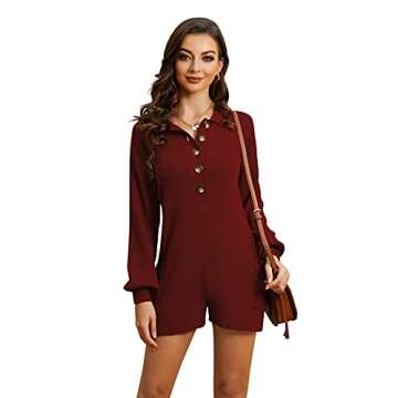 Show moreIntroducing the **Tymidy Women's V Neck Button Down Rompers**, a fall favorite that blends style and comfort effortlessly! Designed with high-quality, stretchy, and soft fabric, this short jumpsuit is perfect for women who desire both fashion and functionality. Featuring a distinctive **deep v-neckline** and a **turn-down collar**, it offers a chic look that can transition from casual lounging to stylish outings. With the added convenience of **pockets**, this versatile romper is suitable for daily wear, whether you're relaxing at home or running errands.