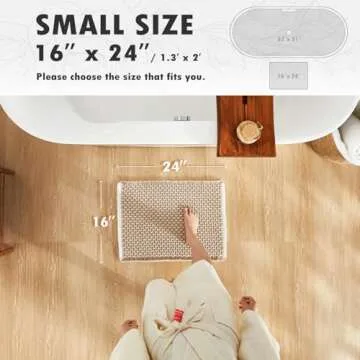 Show more Introducing the TYUU Boho Bathroom Rug, a perfect blend of style and functionality that will elevate your bathroom decor to a whole new level. Crafted with an aesthetic woven design featuring a trendy geometric linear pattern, this rug transforms your bathroom into a chic sanctuary that exudes elegance and tranquility. Sized at 24"x16" and offered in a sophisticated khaki and white color combination, this rug invites comfort and warmth to every step you take. Its soft surface is designed to provide an exceptional sensory experience, making it inviting whether you’re stepping out of a relaxing shower or preparing for a busy day.