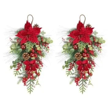 Show more Elevate your holiday decor with the stunning U'Artlines 2 Pcs Christmas Teardrop Swag. Measuring a generous 25 inches in length, this exquisite decoration combines lifelike artificial greenery with vibrant red berries, shimmering poinsettia flowers, and charming pine cones, all harmoniously arranged to bring an enchanting touch to your front door or any space in your home. Perfectly designed to suit various decorative styles, this classic Christmas swag will become a wonderful centerpiece of your celebrations, invigorating your festive atmosphere with its rich colors and intricate details.
