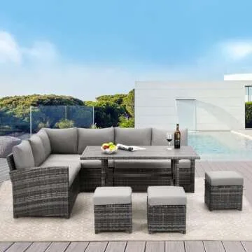 Show moreElevate your outdoor gatherings with the stunning U-MAX 7 Pieces Patio Furniture Set, expertly designed to transform your patio into a stylish oasis. This sectional sofa conversation set features weather-resistant wicker rattan paired with a durable heavy-duty steel frame, ensuring not only a chic aesthetic but also impressive strength with a weight capacity of 660 lbs per seat. The plush cushions are generously upholstered with a thick, soft sponge and premium polypropylene cotton, offering that perfect balance of comfort and support for hours of relaxation. Each cushion is wrapped in a fade-resistant polyester yarn-dyed fabric for vibrant, long-lasting color, making it ideal for outdoor use regardless of the season.