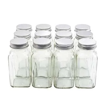 Show more Introducing our stunning set of 12 Spice Jars with Silver Metal Lids, designed to elevate your kitchen organization. Crafted from thick, durable glass, each jar holds a generous 6 ounces, perfect for your favorite spices, herbs, and seasonings. The premium glass material ensures they are dishwasher safe (lids should be hand washed) and are lead-free and BPA-free for your peace of mind. With its square shape, these jars are designed for optimal storage efficiency—stack them side by side or display them in an eye-catching arrangement.