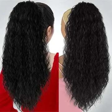 UAmy hair Long Curly Drawstring Ponytail Extension for Women 26 inches Black Long Wavy Clip in Ponytail Synthetic Long Black Drawstring Ponytail for Daily Party Use