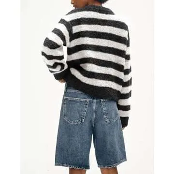 UANEO Women's Striped Cardigan Sweaters Trendy Boucle Button Down Long Sleeve Tops Crewneck Casual Knit Jackets(Black-M)