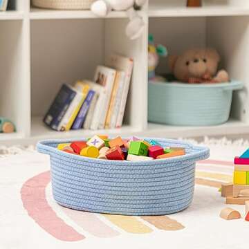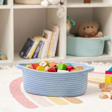 Show more Discover the charm of the UBBCARE Small Woven Basket—a delightful blend of functionality and style. Crafted from natural and harmless cotton rope, this basket offers a soft, skin-friendly storage solution that is utterly safe for babies and pets alike. Measuring 12"x 8"x 5", its compact yet spacious design makes it perfect for organizing toys, blankets, or even fruits. The beautiful blue hue adds a touch of elegance to your décor, while its cute oval shape ensures it fits seamlessly in any room of your home. Embrace a clutter-free environment with this versatile basket that is not only practical but also an aesthetic addition to your space.