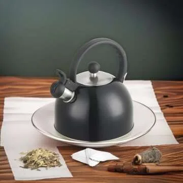 uessegs DFL 2 Liter Stainless Steel Whistling Tea Kettle - Modern Stainless Steel Whistling Tea Pot for Stovetop with Cool Grip Ergonomic Handle (2L Black)