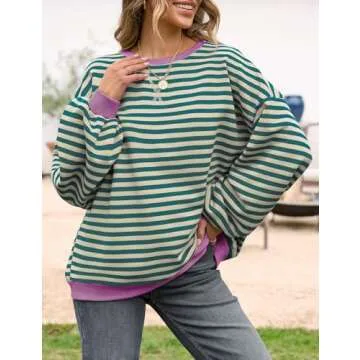 UEU Womens Oversized Long Sleeve Crew Neck Sweatshirts Soft Lightweight Cozy Pullover Tops Malachite Green Striped Large