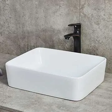 Show more Introducing the Ufaucet 19"x15" Bathroom Sink—a stunning embodiment of modern elegance and functionality. This sleek, European-inspired rectangular vessel sink adds a sophisticated touch to any bathroom setting. Measuring at 19 1/8" x 14 3/4" x 5 1/4", its dimensions make it a perfect fit for above-counter installation in various environments, including homes, restaurants, offices, schools, and both indoor and outdoor spaces. Crafted from high-quality porcelain, this sink promises a luxurious aesthetic coupled with long-lasting durability.