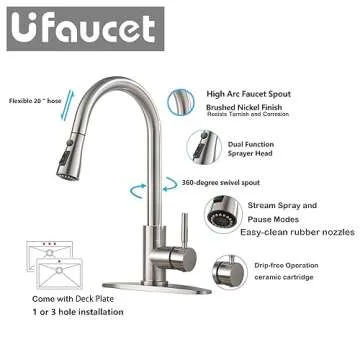 Ufaucet Brushed Nickel Kitchen Faucet with Pull Down Sprayer, High Arc Single Hole Kitchen Sink Faucet with Sprayer, Pull Out Commercial Modern Stainless Steel Kitchen Faucets
