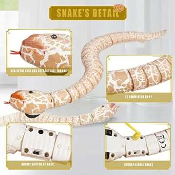 Show moreIntroducing the Ufurty Rely2016 Realistic Remote Control RC Snake Toy, the ultimate blend of fun and realism designed for thrill-seeking kids aged 6 and above. Masterfully crafted from high-quality ABS material, this eco-friendly toy is non-toxic and odorless, ensuring that it is safe for your little ones to play with. Measuring an impressive 16 inches long and featuring 22 segments, its design enables excellent slithering action, allowing it to creep along smoothly on polished floors with rapid movements that mimic a real rattlesnake. This toy is not just a play item; it’s a thrilling experience waiting to be unleashed!