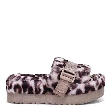 Show moreExperience the height of comfort and style with these unique UGG Fluffitas. Crafted with precision, these slippers feature a printed sheepskin upper that exudes luxury while ensuring your feet stay warm and fashionable. The innovative webbing vamp strap showcases the iconic UGG graphic logo, blending aesthetics with utility. Inside, a sumptuous 10mm curly sheepskin lining and insole cradle your feet, providing unparalleled softness, making every step feel like walking on clouds.